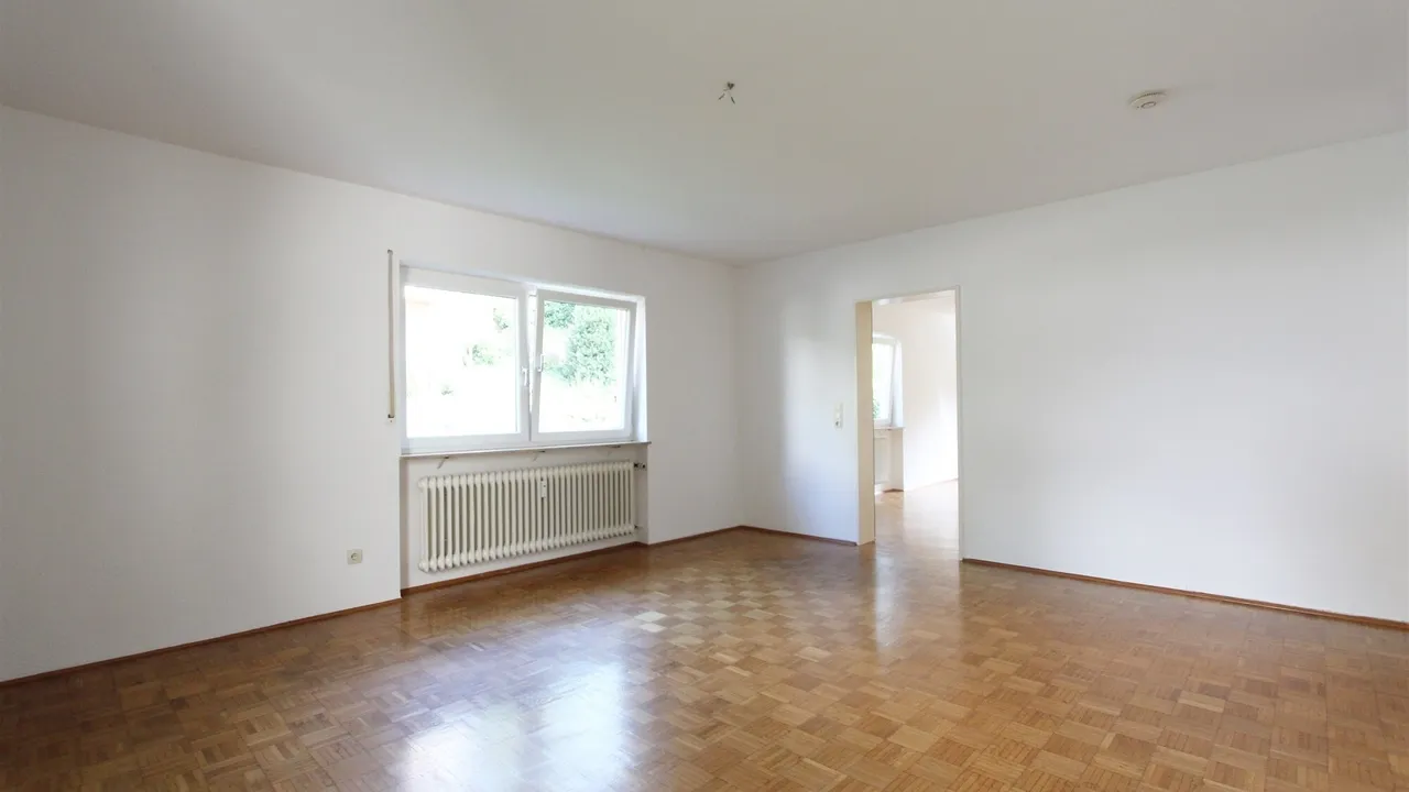 Geradeaus des Flures finden Sie den mit urigem Parkettboden ausgestatteten Wohnbereich vor. Dieser bietet Ihnen auf einer Fläche von ca. 24 m² genügend Platz um sich großzügig einzurichten.