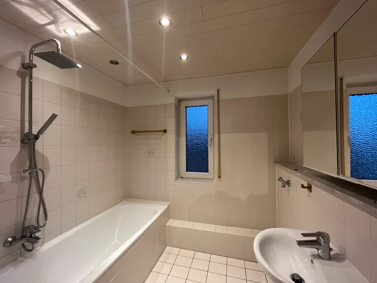 Geradeaus des Flures befindet sich das Tageslichtbadezimmer. Dieses ist mit einer Duschbadewanne ausgestattet und verfügt zudem über einen Waschmaschinenanschluss. An das Badezimmer angrenzend finden Sie die separate Toilette vor.