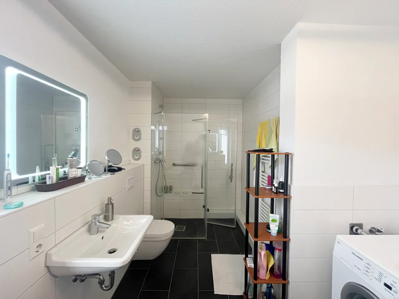 Das Badezimmer befindet sich rechts des Eingangsbereichs und beeindruckt mit einer ebenerdigen Dusche sowie einem Anschluss für Ihre Waschmaschine.
