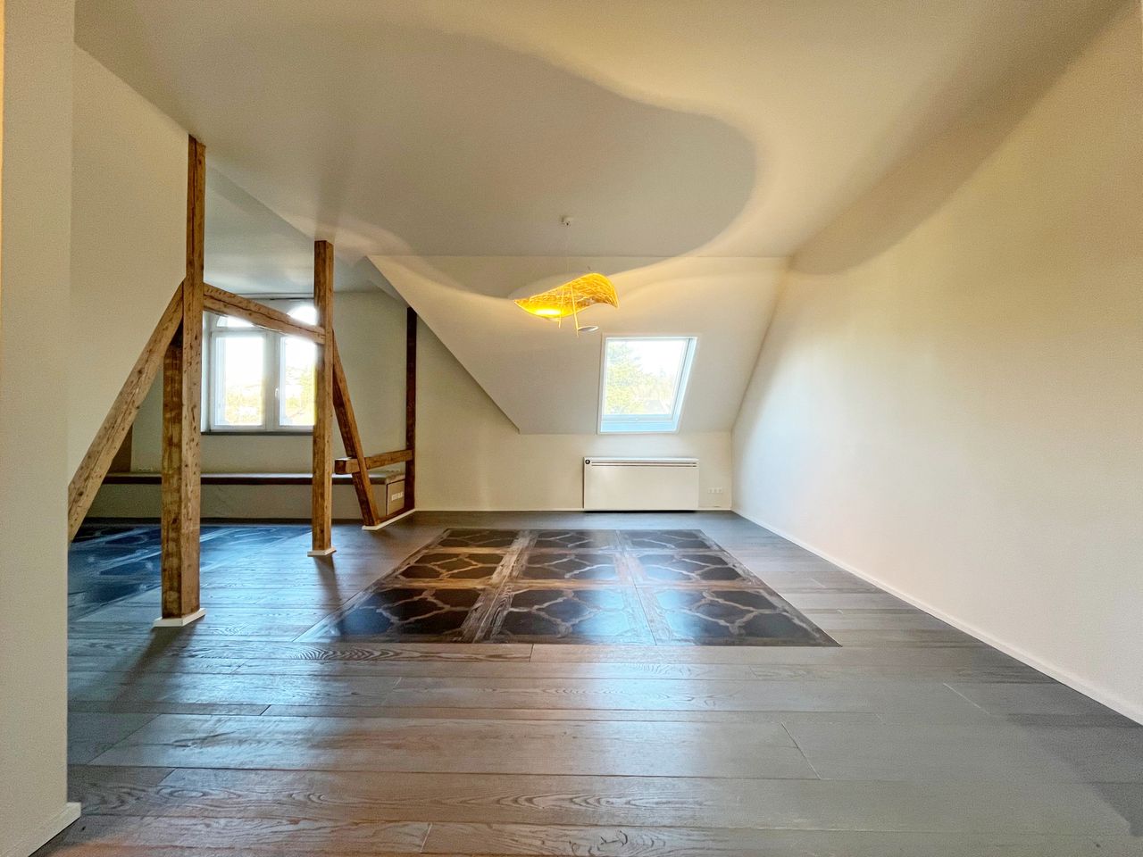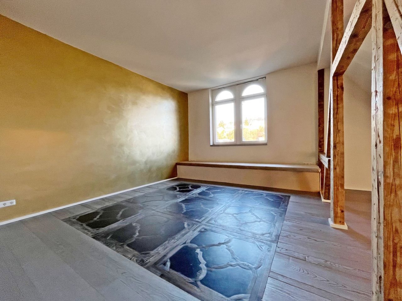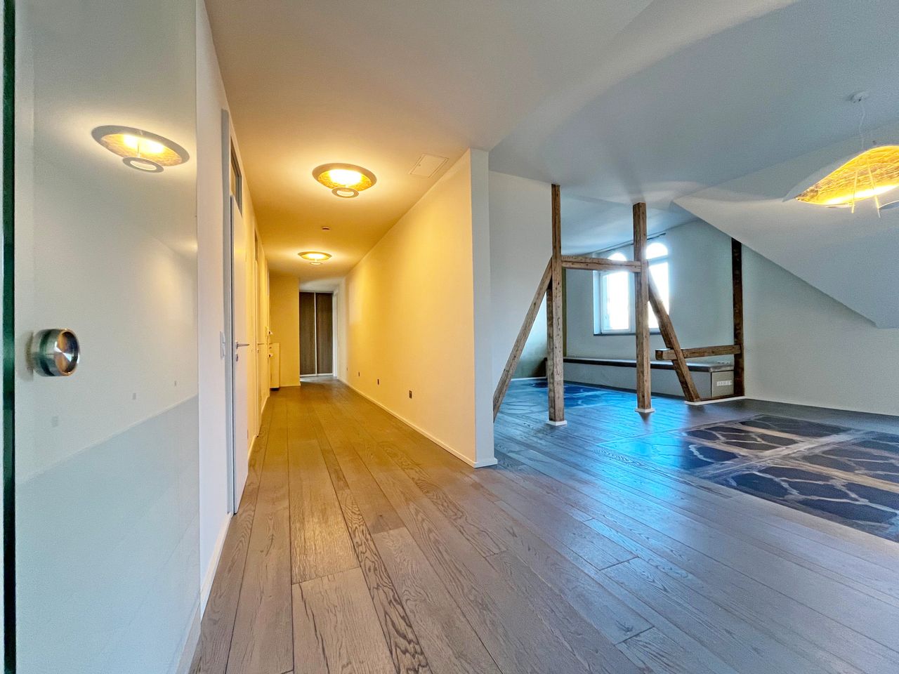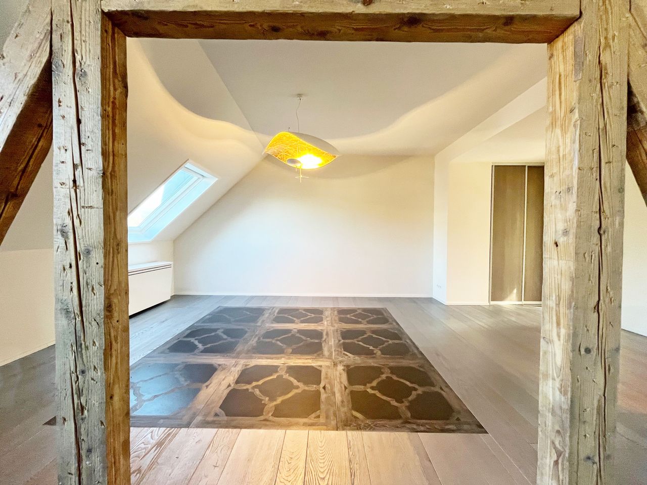 Rechts des Entrées gelangen Sie in den charmanten und zugleich großzügigen Wohn- und Essbereich. Der Raum besticht durch seine besondere Atmosphäre, die durch die freigelegten Holzbalken, den hochwertigen Parkettboden sowie den eleganten Marmorboden, der in bestimmten Bereichen eingelassen wurde, noch verstärkt wird. Dieser Raum bietet Ihnen genügend Fläche, um sich voll und ganz nach Ihren persönlichen Wünschen einzurichten.