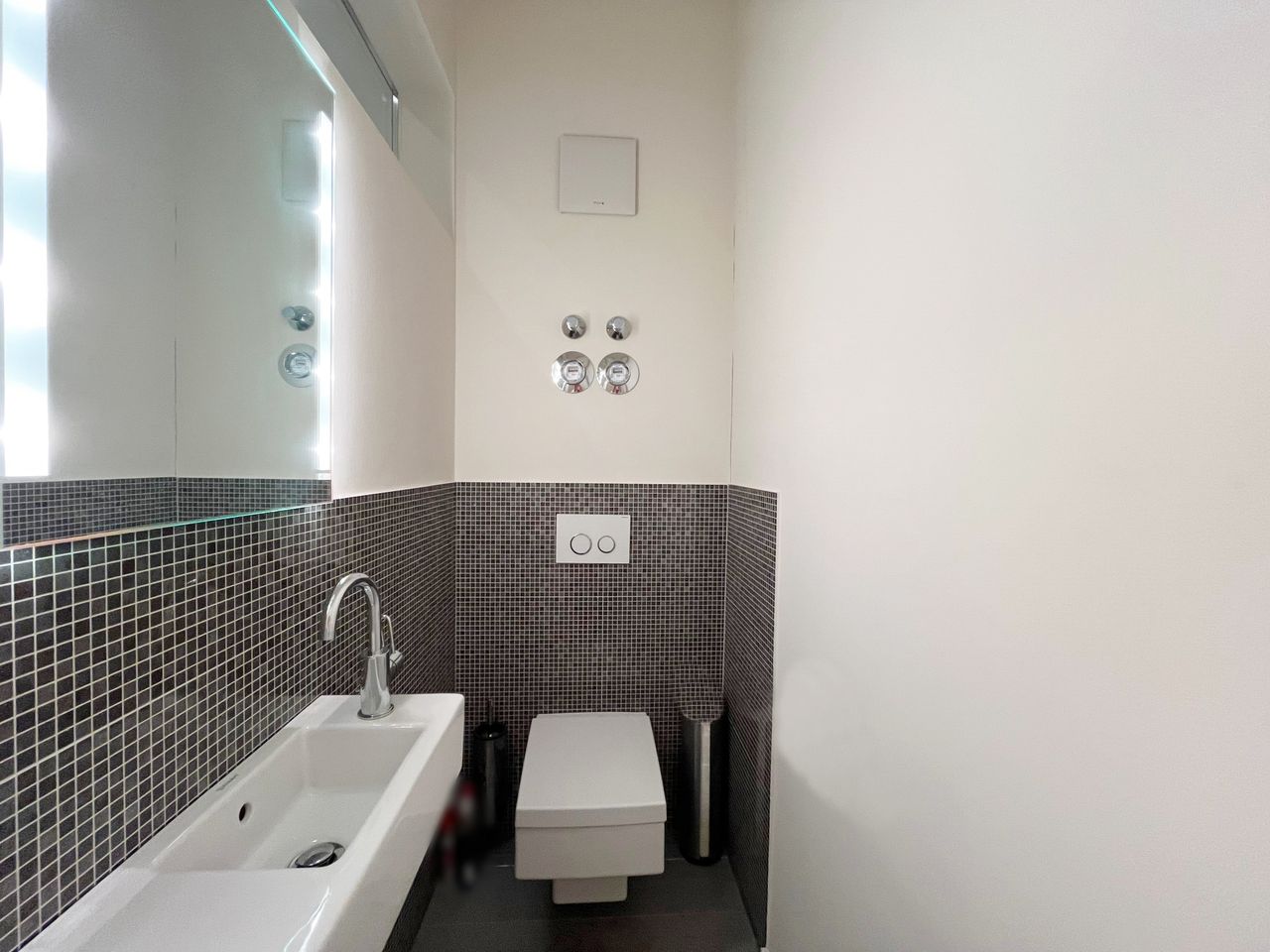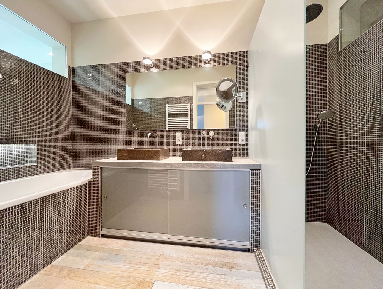 Das moderne und zugleich funktionale Badezimmer ist mit einer nahezu ebenerdigen Dusche sowie einer Badewanne ausgestattet. Die Wände sind zudem mit edlem Mosaik gefliest, was dem Raum eine elegante Note verleiht. Die Toilette ist vom Badezimmer separiert und befindet sich rechts von diesem.