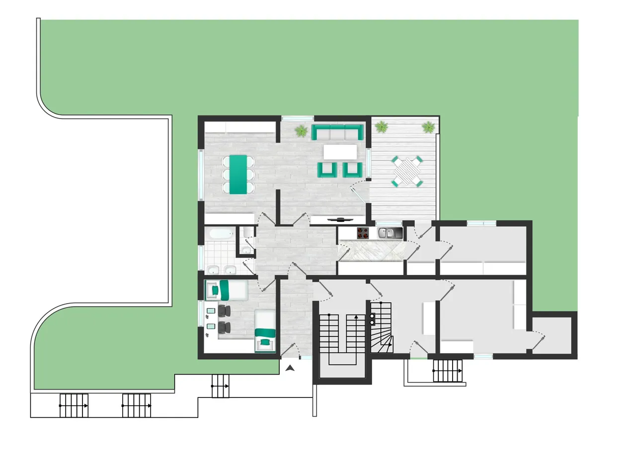 Die separate Einliegerwohnung eröffnet zusätzliche Optionen – als Gästebereich, Atelier, Homeoffice oder zur Vermietung. Das großzügige Wohn-/Esszimmer öffnet sich zu einem geschützten Innenhof – eine grüne Oase mit hohem Wohlfühlfaktor. Beide Wohneinheiten lassen sich bei Bedarf harmonisch verbinden.